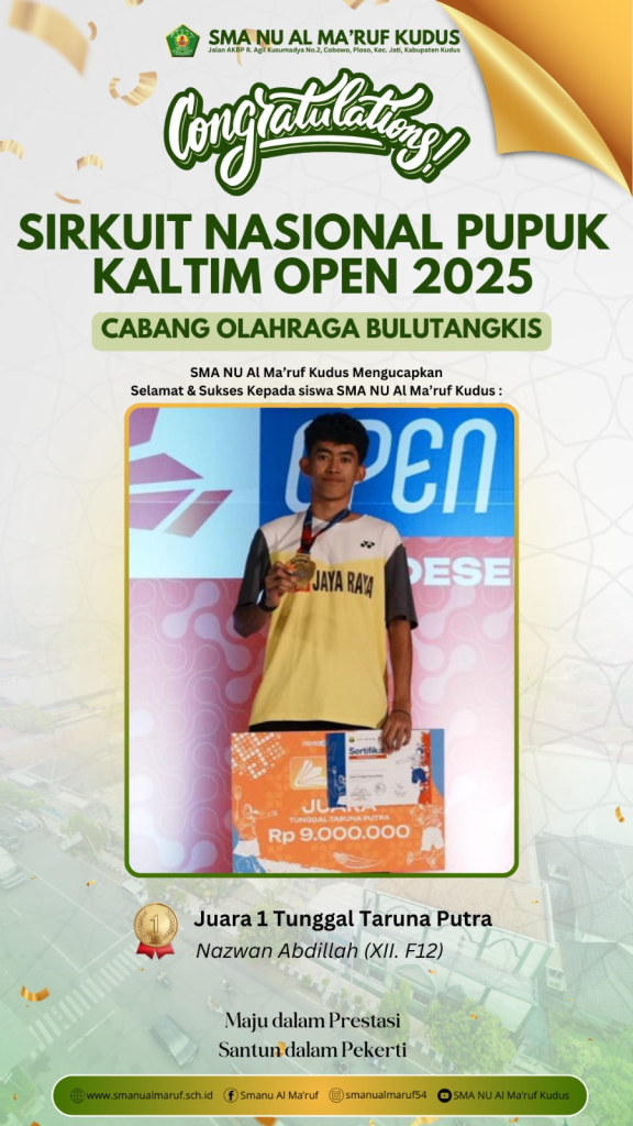 SMA NU Al Ma’ruf Kudus kembali mencatatkan prestasi gemilang di bidang olahraga. Kali ini, prestasi membanggakan diraih oleh Nazwan Abdillah, siswa kelas XII F12, pada ajang Sirkuit Nasional Pupuk Kaltim Open 2025 cabang olahraga bulutangkis.