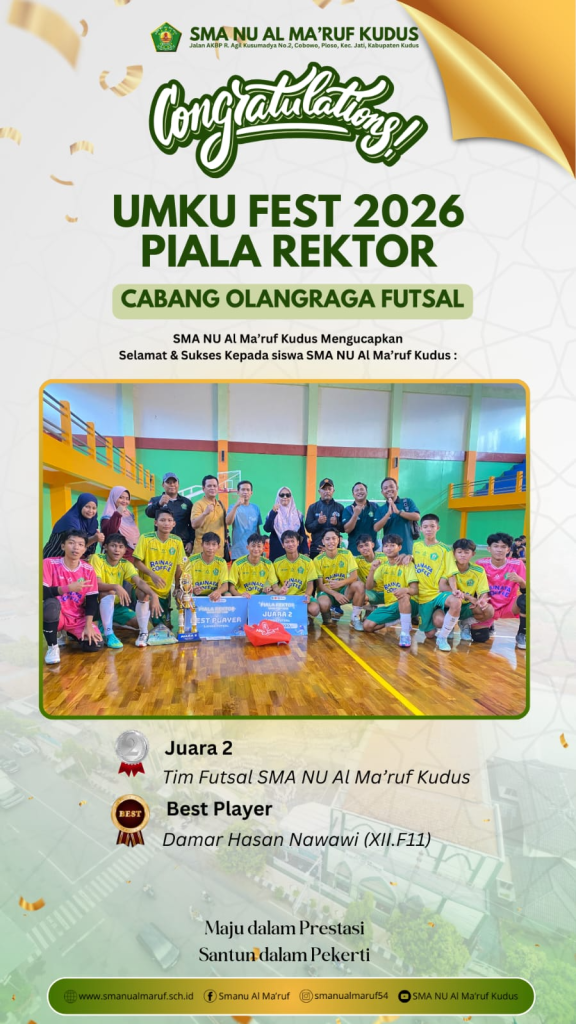Keluarga besar SMA NU Al Ma’ruf Kudus mengucapkan selamat dan sukses kepada Tim Futsal serta Damar Hasan Nawawi atas capaian yang membanggakan ini. Semoga prestasi ini menjadi motivasi untuk terus berkembang, meningkatkan kualitas permainan, dan meraih hasil yang lebih gemilang di kompetisi berikutnya.